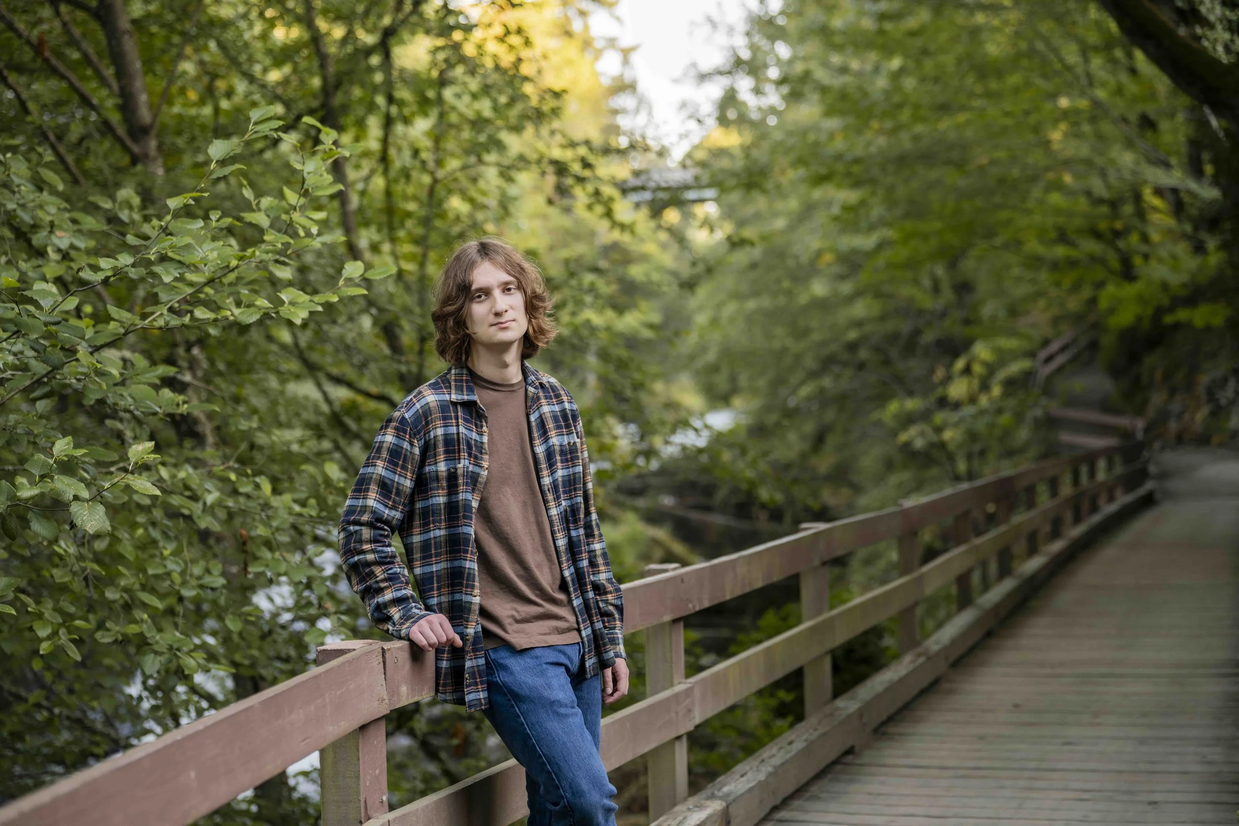 For his session, Jonah kept it timeless and laid-back — a plaid button-up layered over a simple tee, paired with classic jeans. The look felt perfectly at home at Tumwater Falls Park, blending that casual PNW vibe with a touch of personality. His red Vans added just the right pop of color, making the portraits both relaxed and stylish.
